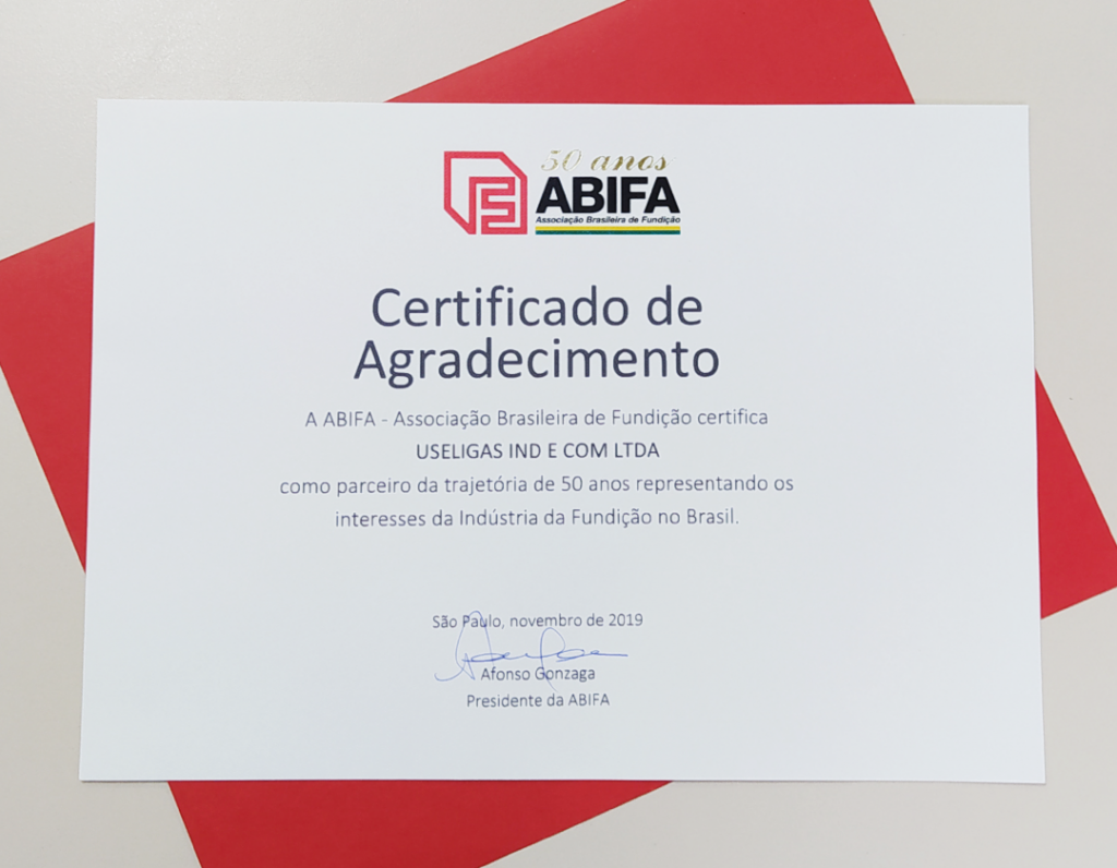 A Useligas recebeu o Certificado de Agradecimento pela sua parceria com a ABIFA – Associação Brasileira de Fundição. Nos orgulhamos de fazer parte da história de uma entidade tão importante que compromete-se com o desenvolvimento das empresas de fundição para o fortalecimento e crescimento da Indústria da Fundição no Brasil. A ABIFA – Associação Brasileira […]
